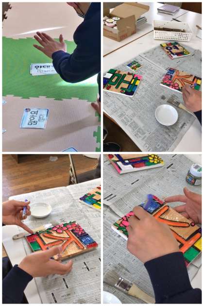 カルタを使って遊んだ後、今年度の卒業制作となる朝文研の新しい看板作りの仕上げのニス塗りをしました。