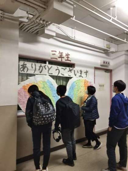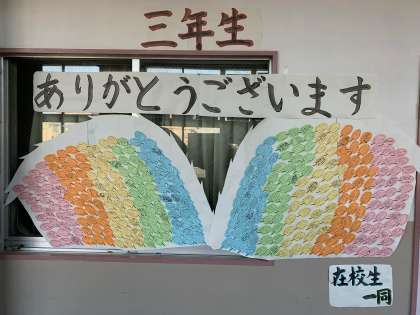 在校生全員が卒業生へのメッセージを書き、一対の羽根の形にして放送室前に飾りました。