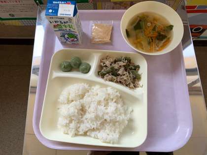 豚肉と野菜の炒めもの すまし汁 きな粉よもぎ団子 米飯 牛乳