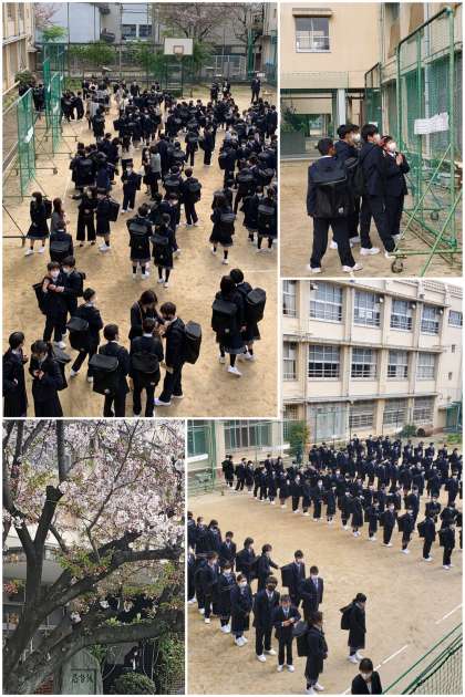 9時前から新入生が登校し始めて、クラス分けの掲示を期待に胸膨らませ眺めています。クラスごとに整列して入学式の開式を待っています。