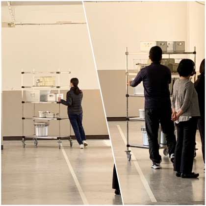 給食は安立小学校から配送された後、配膳員さんによってエレベーターで2,3階まで上げられた後、各学年の先生方が教室近くまで運んでいます。生徒のみなさんが喫食するまでにたくさんの人の協力があります。