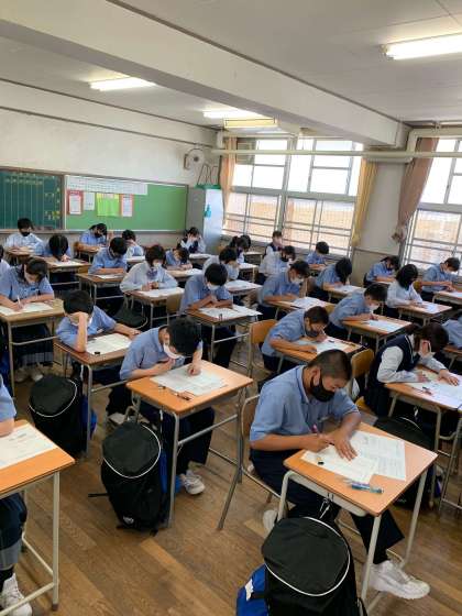 1年生では、これまでの学習内容を確認するためのテストを行なっています。中学校での定期テスト初めて体験する機会ですが、集中して受験しています。