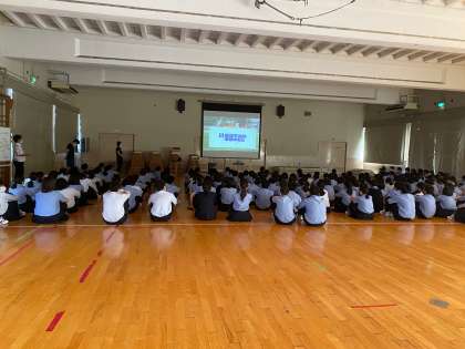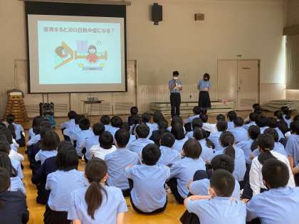 1年生では、7限に熱中症予防講座を行い、正しい予防方法を知り、普段から気をつけることで熱中症を防ぐための学習をしました。保健室の吉田先生とともに保健委員の生徒も参加して実施しました。