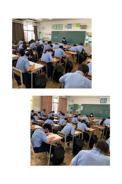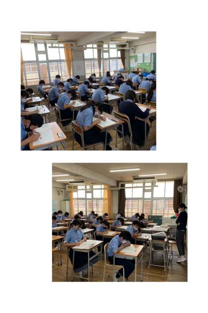 3限目、1年生は技術家庭科のテストです。作図の問題にも取り組んでいます。2,3年生は社会科のテストです。残り1教科となりました。疲れもあるでしょうがみんながんばっています。