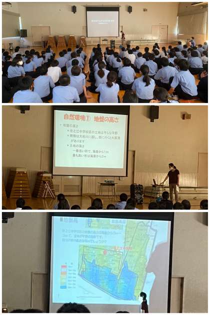 6限に体育館で防災学習を行いました。スライドを見ながら、中学校校区の状況などを学習しました。