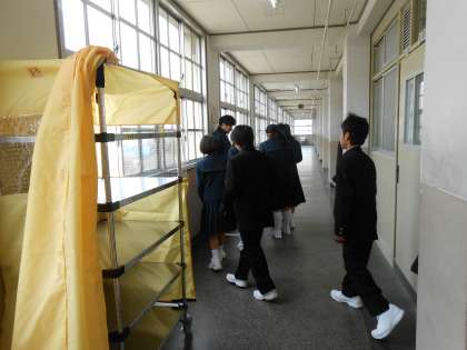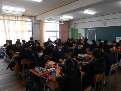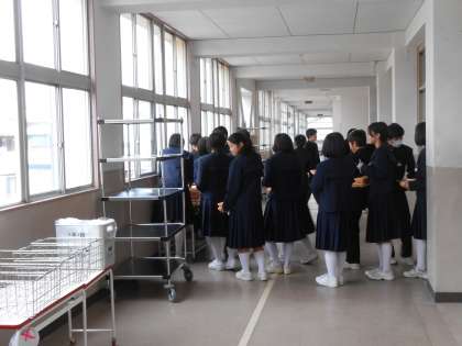 記念すべき中学校1日目の給食を受け取った生徒たちは、