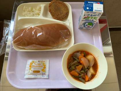 チキンレバーかつ ケチャップ煮 キャベツのバジル風味サラダ コッペパン マーマレード 牛乳