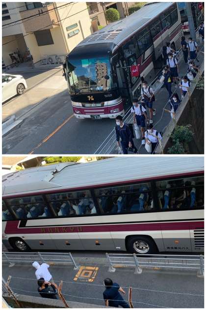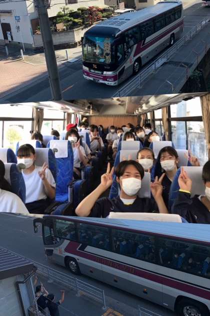 バスも到着し、8時20分ごろから乗車が始まりました。他学年の先生の見送りもある中で、8時30分すぎに予定通り出発しました。いよいよ3日間の旅の始まりです。