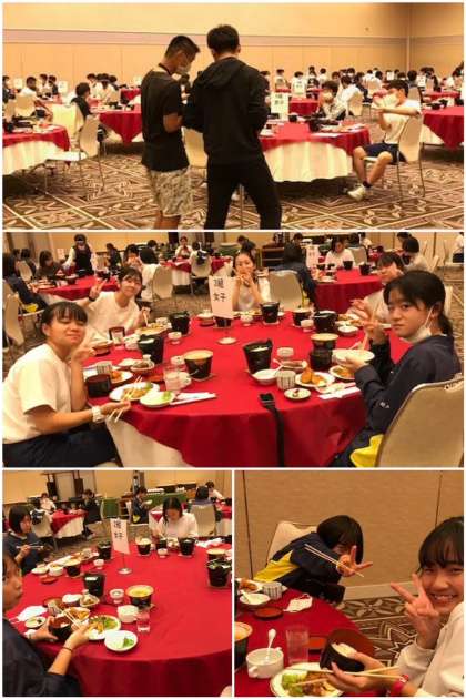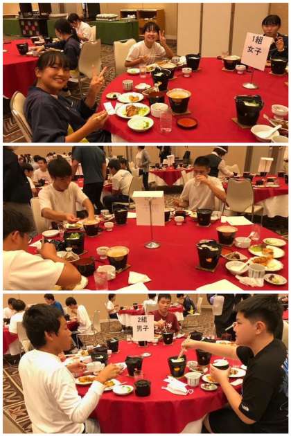 2日目の宿舎、砺波ロイヤルホテルに到着し、夕食をとっています。