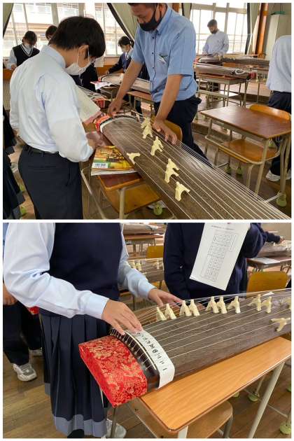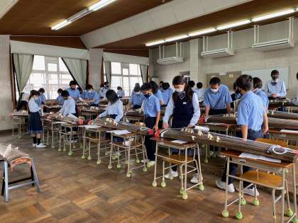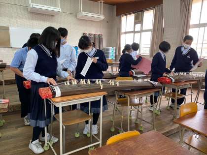 音楽の授業で琴の練習をしています。感染症対策にも配慮して音楽の授業を行えるように準備しました。