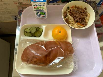 タンタンめん きゅうりの甘酢づけ みかん 黒糖パン 牛乳