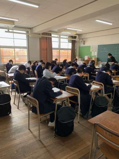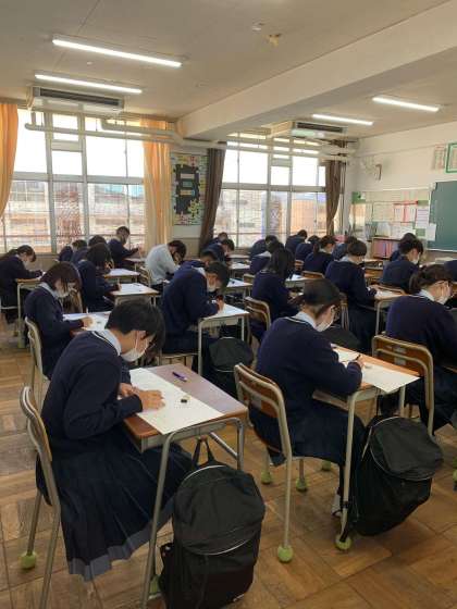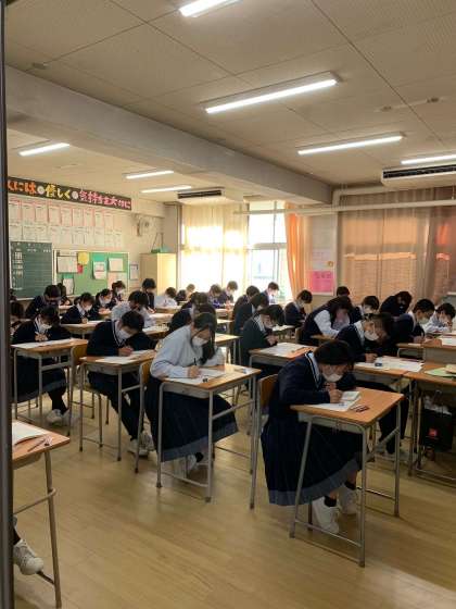 今日、明日と2学期の期末テストが実施されます。4限目は1.2年生は理科、3年生は英語のテストです。どの学年の生徒も集中して受験しています。