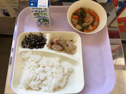 鶏肉のゆず塩焼き 含め煮 魚ひじきそぼろ 米飯 牛乳