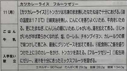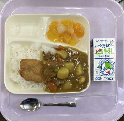 今日は、カツカレーライスに牛乳。