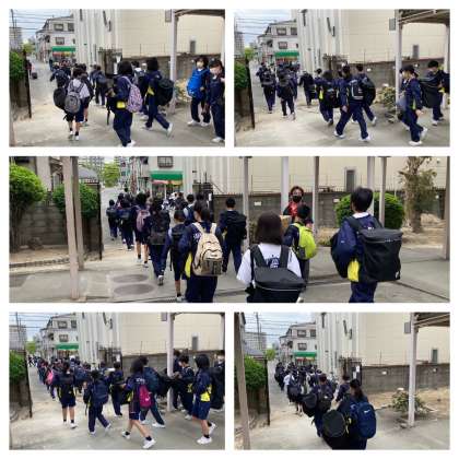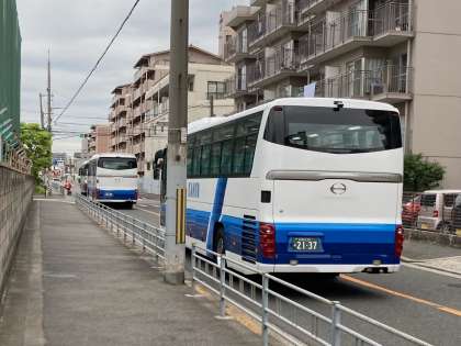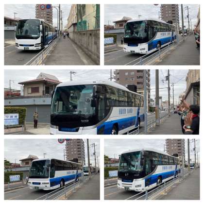 学校北側の道路に停めているバスに乗車して、9時18分に一路貝塚に向けてバスが出発しました。