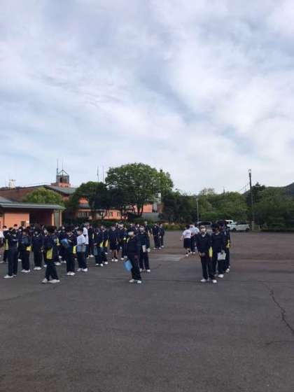 朝のつどいにみんな集まってきています。