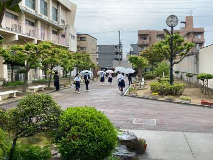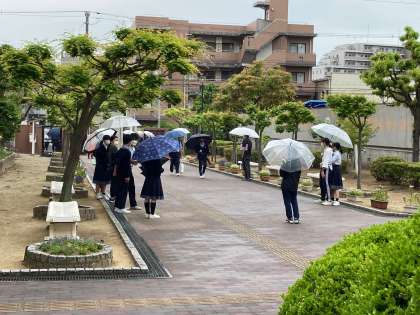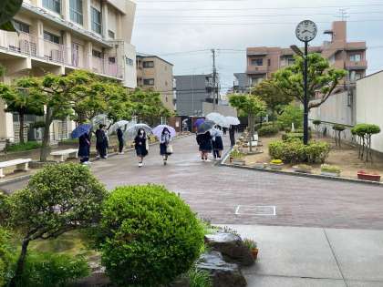 雨の中の登校になりました。1年生は、一泊移住の翌日ということで2限からの登校です。昨日同様に少しさみしい登校風景になりました。