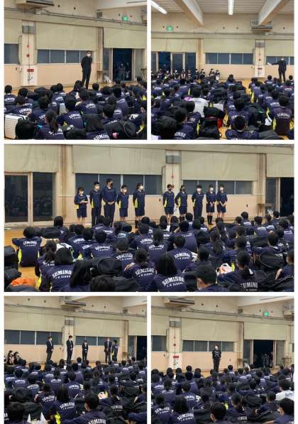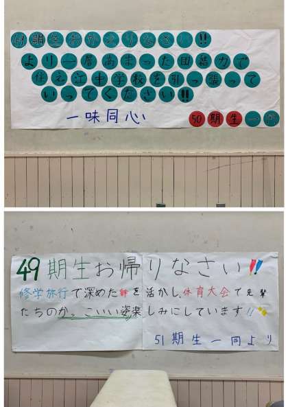 体育館の壁には、1.2年生の後輩からのメッセージが飾られていました。明日から再度気を引き締めて、最高学年として後輩たちを引っ張っていってください。