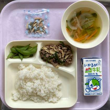 チンジャオニューロースー、ハムと野菜の中華スープ、枝豆とアーモンドフィッシュでした。