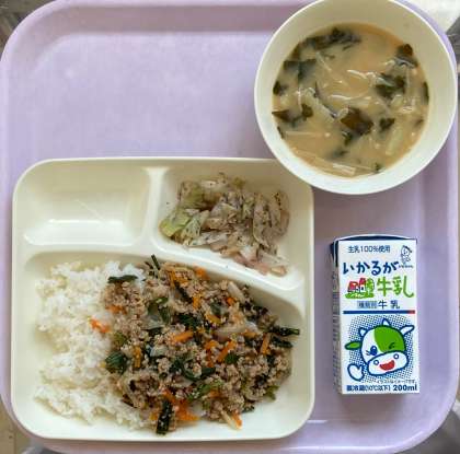 今日は、豚ひき肉とニラのそぼろ丼と牛乳。