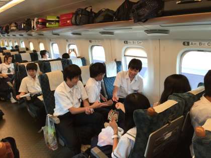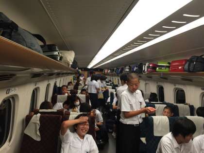 住之江中学校42期生は、遅刻者0で新大阪駅を出発し、現在山口県の下関周辺を新幹線で進んでいます。車内では、ゲームをしたり、お菓子を食べたり、楽しんでいます。