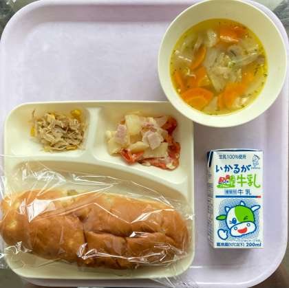 今日は、おさつパンに牛乳。
