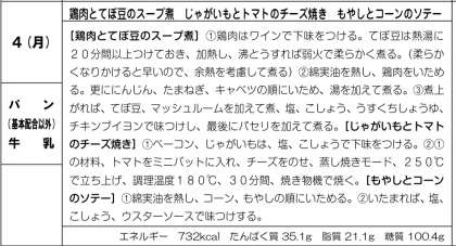 鶏肉とてぼ豆のスープ煮、じゃがいもとトマトのチーズ焼きともやしとコーンのソテーでした。