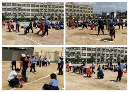 2年生は、運動場で水消火器訓練を行いました。