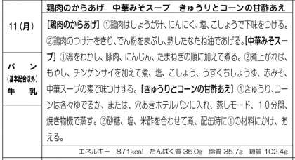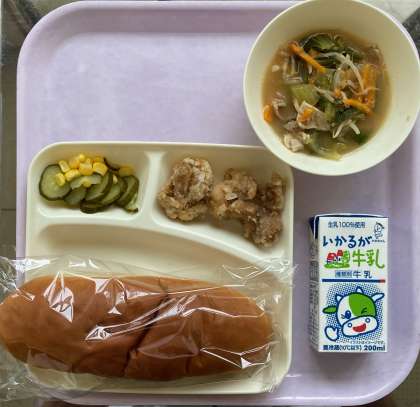 鶏肉の唐揚げ、中華みそスープ、きゅうりとコーンの甘酢和えでした。