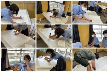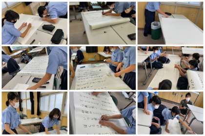 今日の放課後、1年生は各クラスの代表者たちが集まって、合唱コンクールに向けて、クラス内に掲示する大きな歌詞カードを作りました。