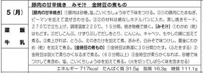 豚肉の甘辛焼き、みそ汁と金時豆の煮物でした。