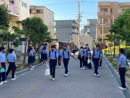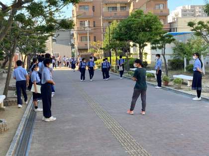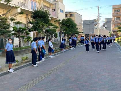 校門では、生徒会・生活委員・学級委員・有志の皆さんが登校する生徒に「おはよう」と声を掛けています。