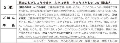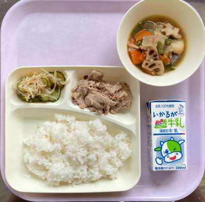 豚肉のねぎ醤油焼き、吹寄せ煮、きゅうりともやしの甘酢和えでした。