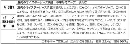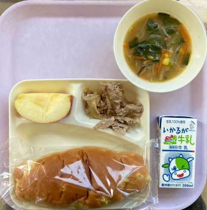 豚肉のオイスターソース焼き、中華スープとりんごでした。