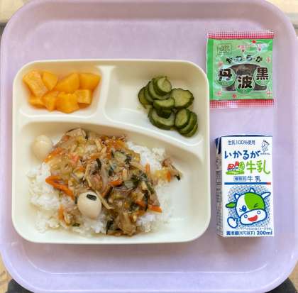 今日は、中華丼と牛乳。