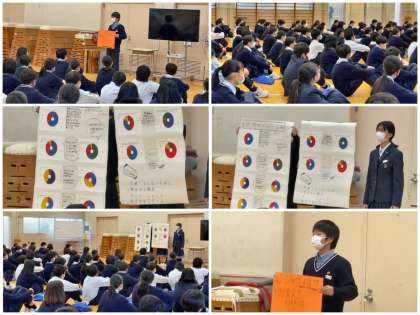 保健委員会から、睡眠に関するアンケート結果のまとめの報告ありました。また、それを1年生校舎の廊下に貼り出すので見てくださいとの話がありました。