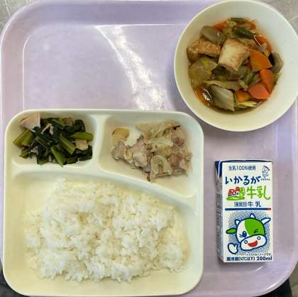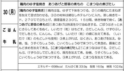 鶏肉の柚子塩焼き、厚揚げと野菜の煮物、小松菜の煮浸しでした。
