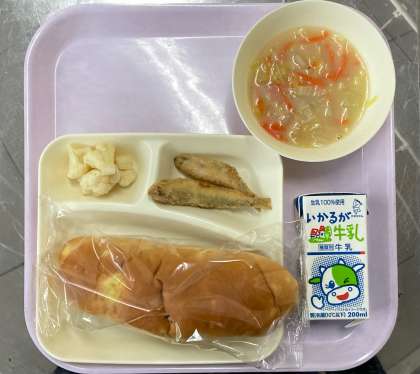 今日は、おさつパンに牛乳。