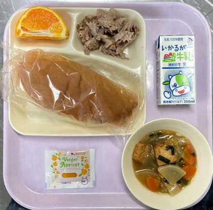 今日は、コッペパン(あんずジャム)と牛乳。