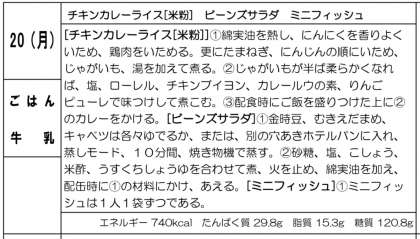 今日は、チキンカレーライス(米粉)、ビーンズサラダとミニフィシュでした。