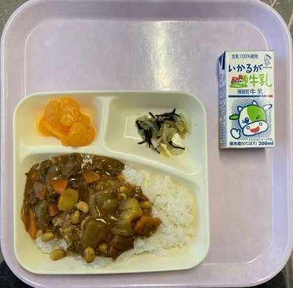 今日は、牛肉と大豆のカレーライスと牛乳。
