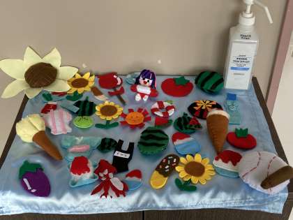 校長室前に作品が展示されています。これは、家庭科部の作品です。