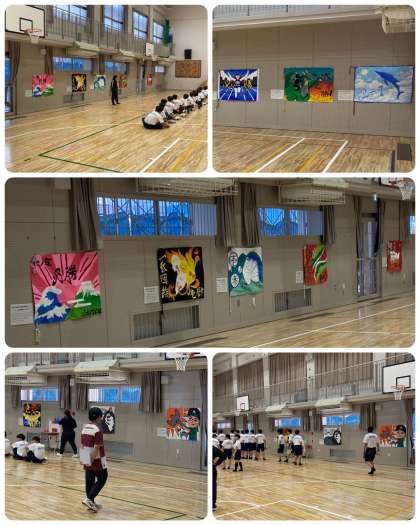 各クラスで応援旗の図案を募集し、クラス毎に作成されています。