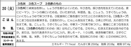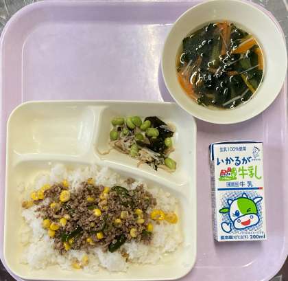 3色丼の具材は、合い挽き肉にコーンとピーマンでした。これが案外、生徒に人気がなくビックリしました。