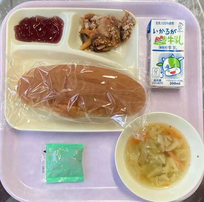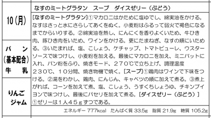 なすのミートグラタン、スープとダイスゼリー(ブドウ)でした。