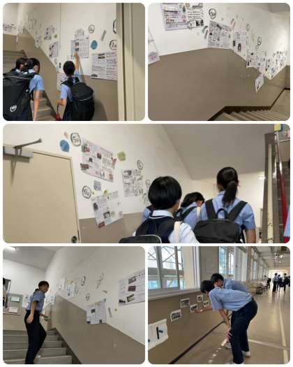 2年生の廊下では今、7月7日に京都に行った校外学習で撮った写真のフォトコンテストや学んだことをまとめた壁新聞を掲示しています。