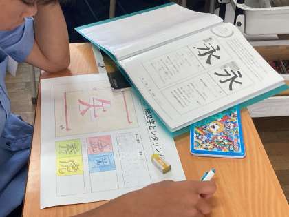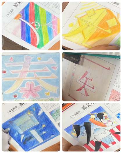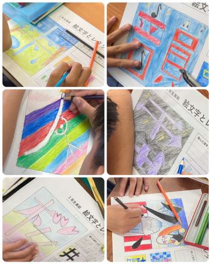 レタリングで文字を描く基本を学習し、文字の意味を考えた絵文字の創作をしています。