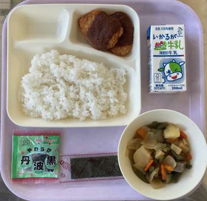 味噌カツ、じゃがいもと野菜の煮物、焼き海苔、ソフト黒豆でした。