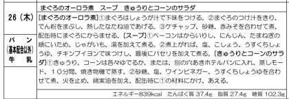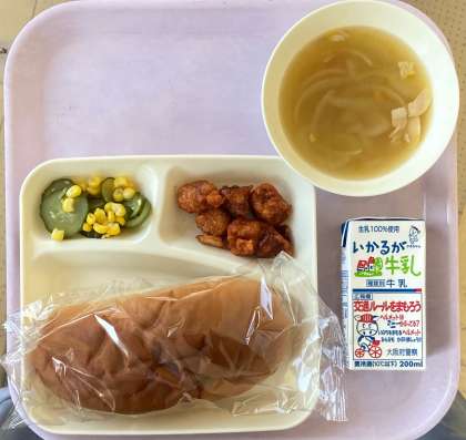 マグロのオーロラ煮、スープ、きゅうりのコーンサラダでした。
