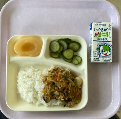 今日は、中華丼、きゅうりのピリ辛和え、白桃(缶)でした。